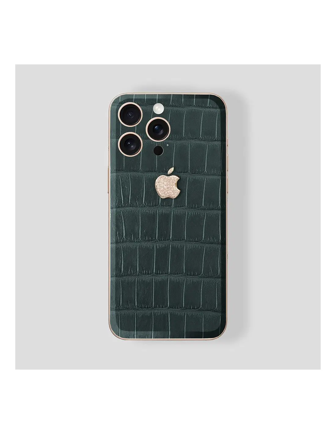 Custom iPhone 16 Rose Gold 24K | Green Emerald Alligator | Diamond Rose Gold Logo
