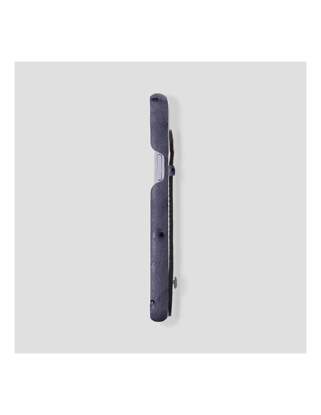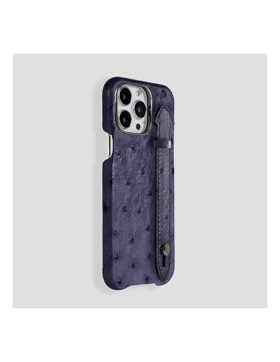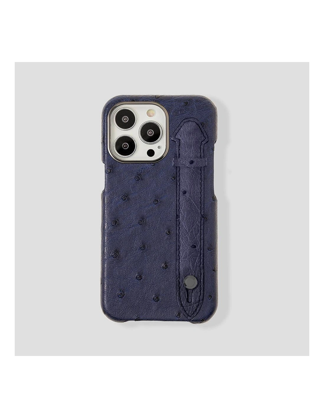 iPhone 15 Handle Case Ostrich | MagSafe. The case boasts a hand strap crafted from leather, ensuring a secure grip on your phone. Integrated magnets guarantee compatibility with MagSafe technology. Every case is constructed using a thermoforming technique to adhere the leather, which fortifies it against high temperatures. Conceived and meticulously assembled in Italy with masterful accuracy.