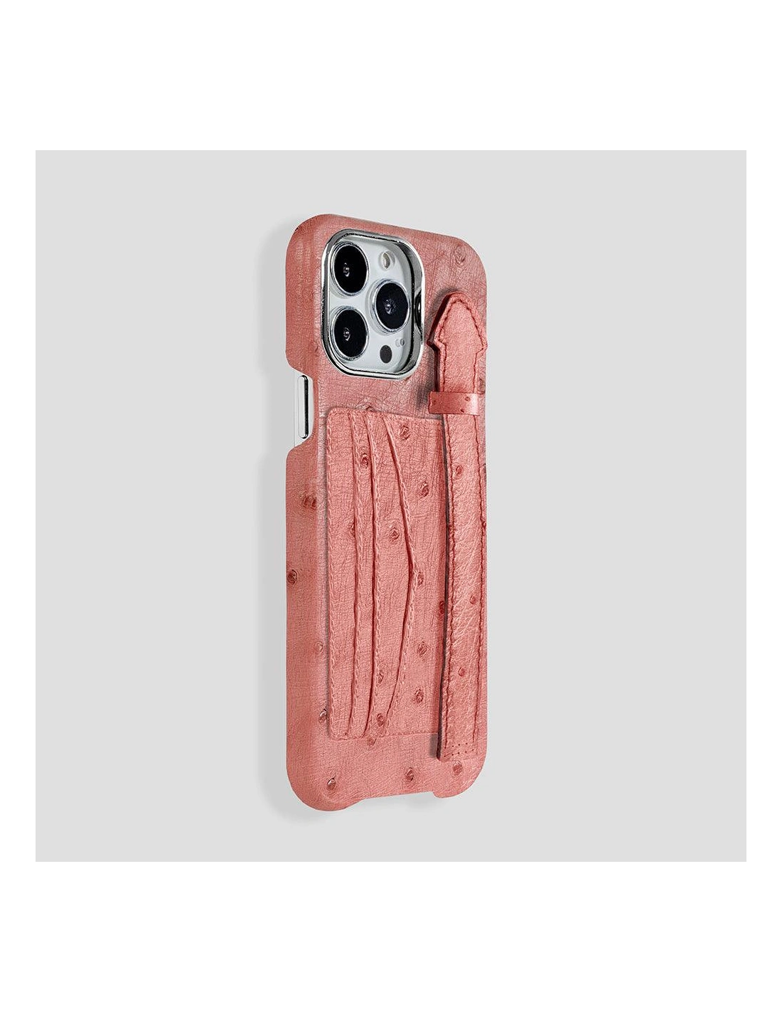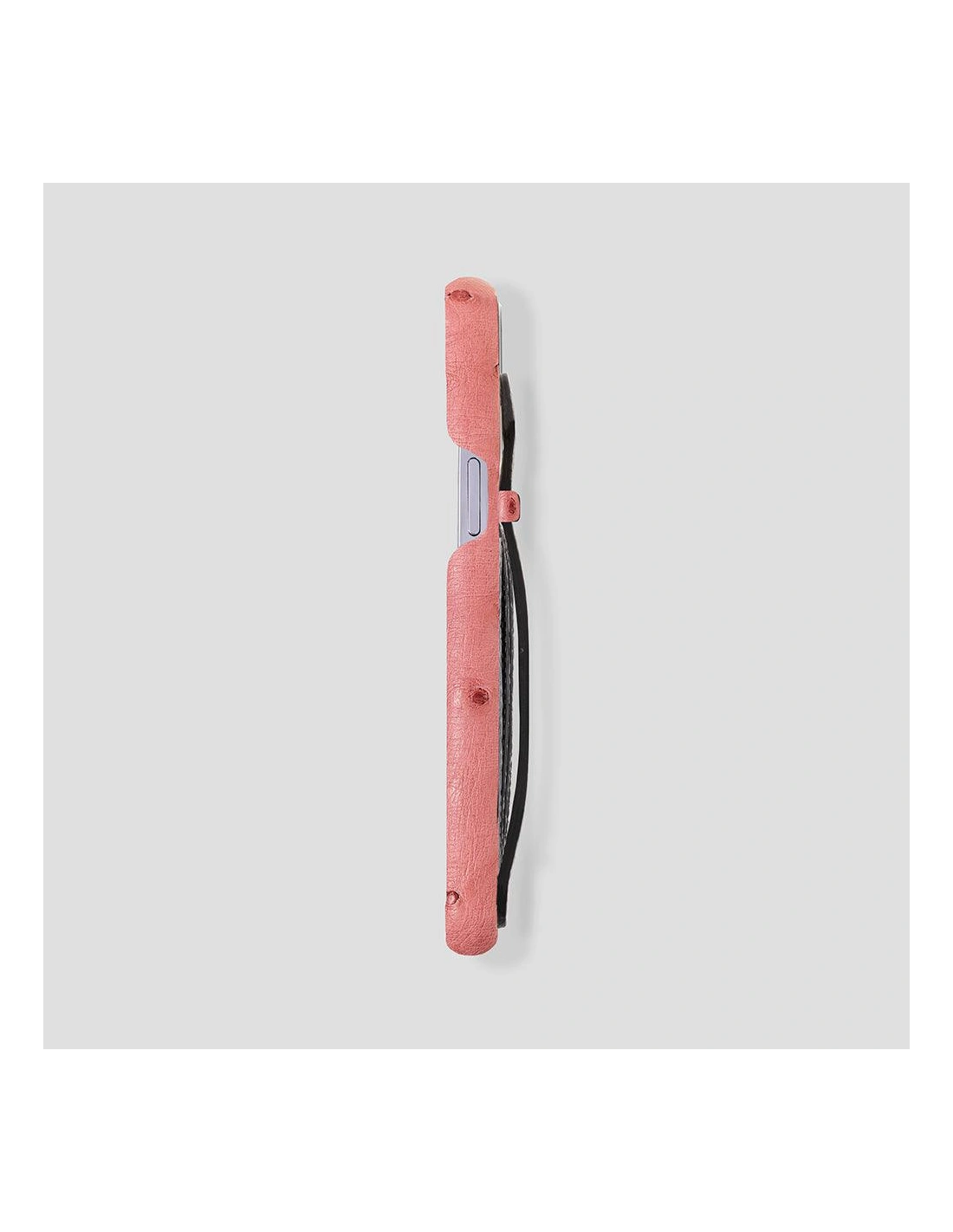 iPhone 16 Pro Cardholder Finger Strap Case Ostrich with Strap in supreme genuine ostrich leather is a convenient and luxe everyday accessory with 3 credits card and ID pocket. All our cases are made by applying the leather through the thermoforming technique. By making it this way the leather is resistant to high temperatures. Crafted with precision and care by italian artisans.