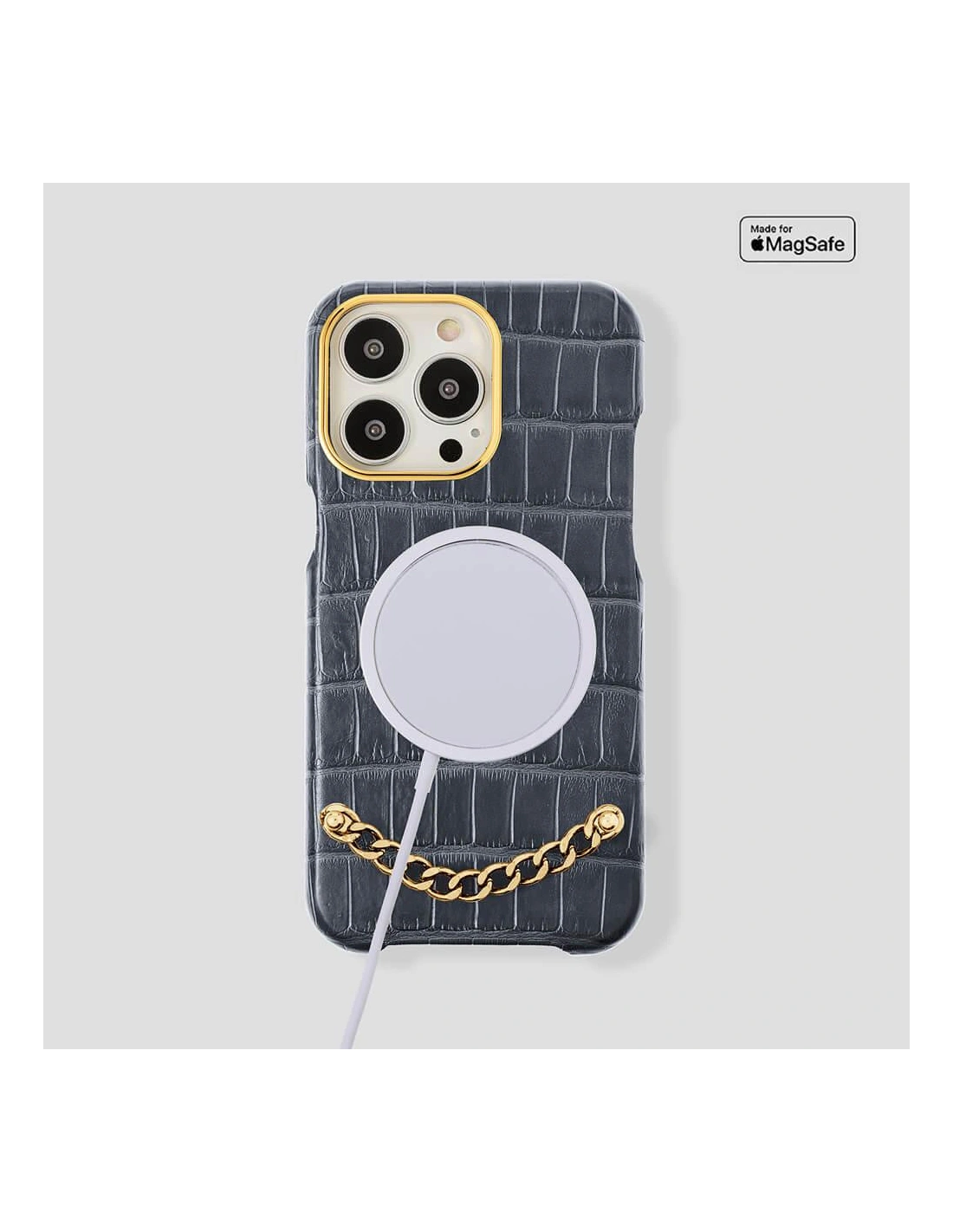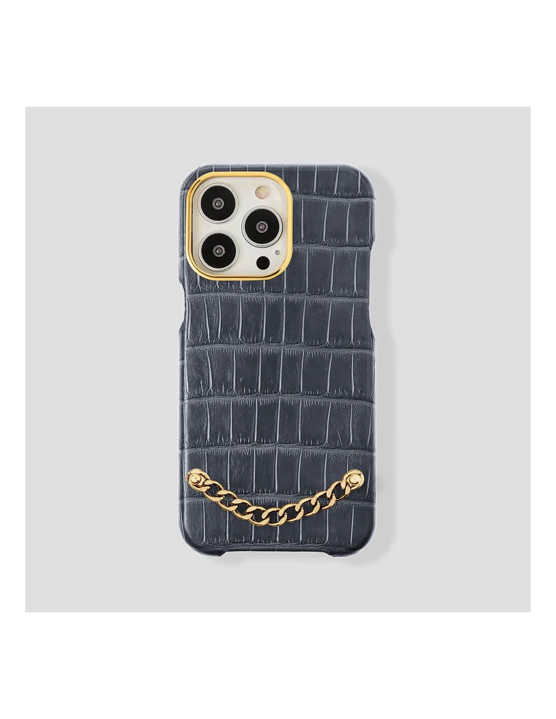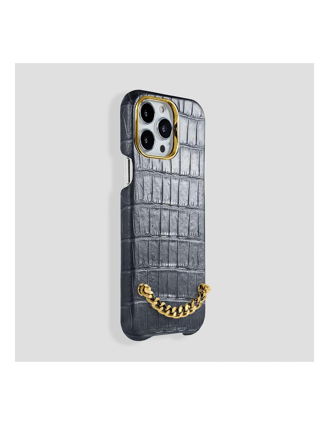Preziosa Alligator Case for iPhone 14 a high-level product that represent our concept of luxury. An object that is refined in every detail, as refined and valuable as a jewel. The chain on the back of the cover give the possibility the insertion for customize this product which is already unique in its kind. All our cases are made by applying the leather through the thermoforming technique. By making it this way the leather is resistant to high temperatures.